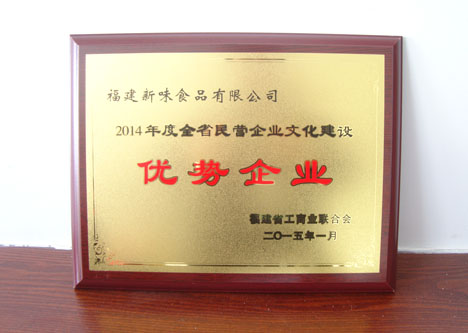 熱烈祝賀“福建新味食品有限公司”被福建省工商業(yè)聯(lián)合會(huì)評為“2014年度全省民營企業(yè)文化建設(shè)優(yōu)勢企業(yè)”稱號。
